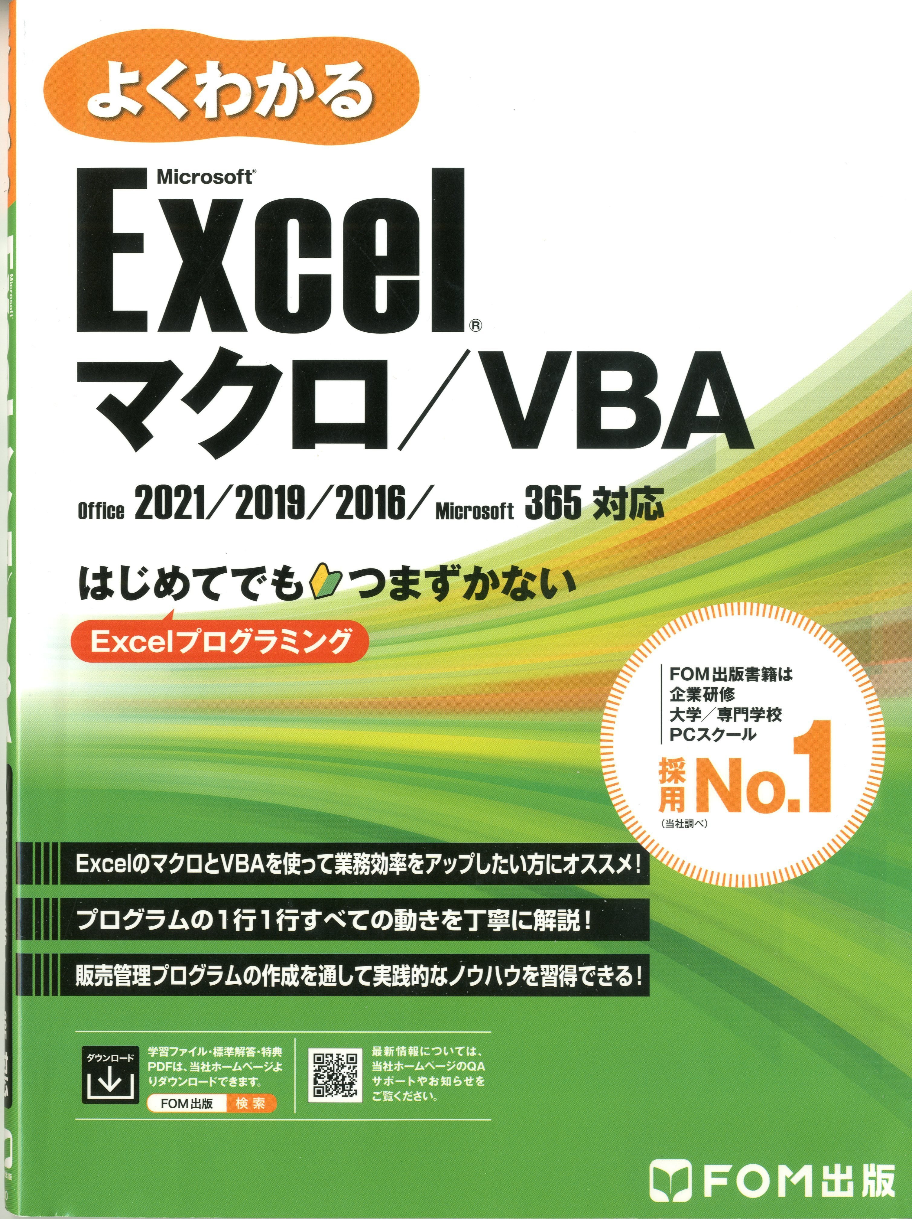こちらは、FOM出版の「よくわかるExcelマクロ/VBA Office2021/2019/2016/Microsoft365対応」です。ExcelのマクロやVBAを学ぶために特別に作られた教材で、実践的なスキルを効果的に習得することができます。