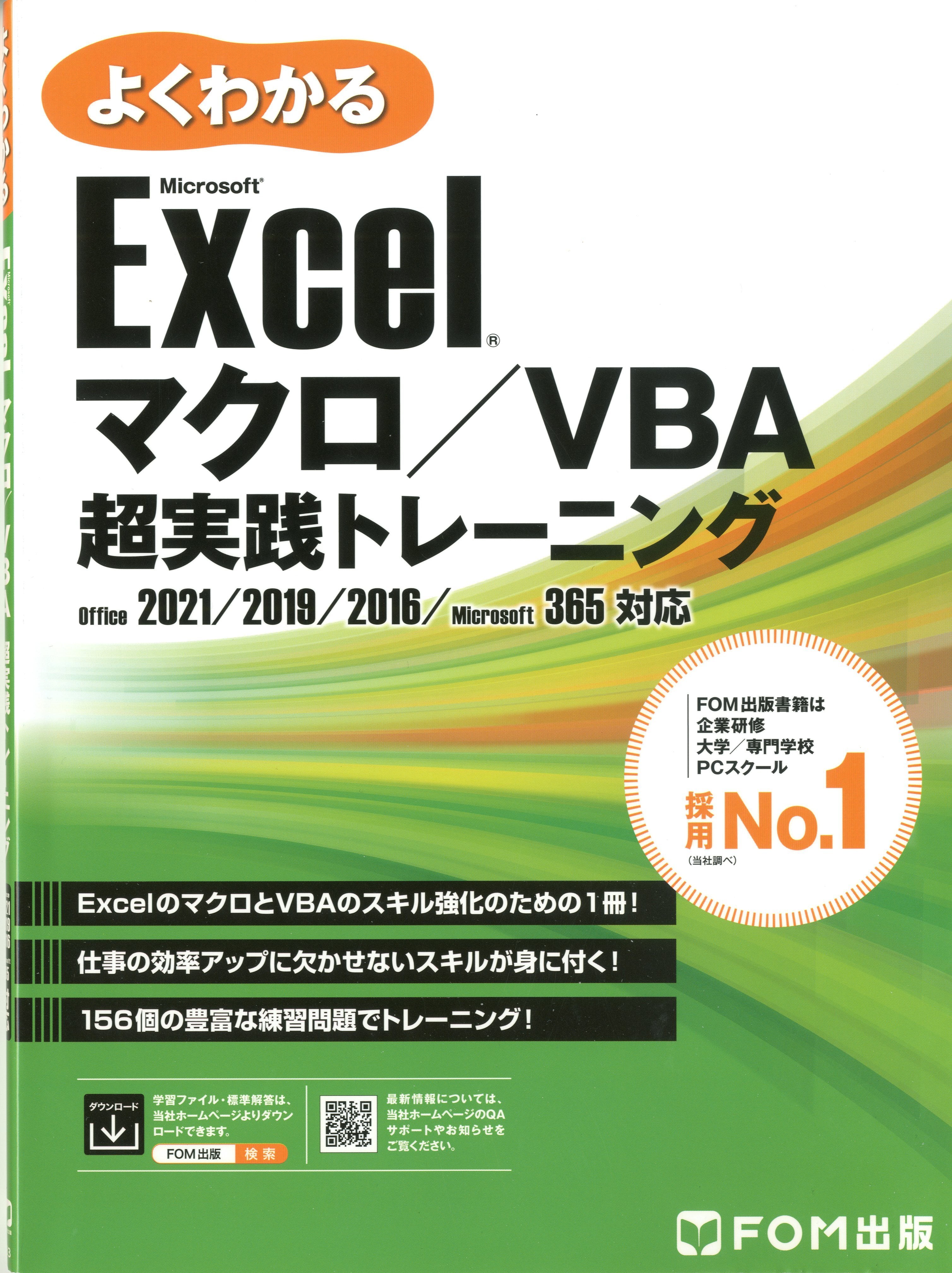 こちらは、FOM出版の「よくわかるExcelマクロ/VBA超実践トレーニング Office2021/2019/2016/Microsoft365対応」です。ExcelにおけるマクロとVBAの実践的なスキルを手に入れるために特別に設計された教材で、効率的な学習を実現できます。「FOM出版よくわかるExcelマクロ/VBA Office2021/2019/2016/Microsoft365対応」と、「FOM出版よくわかるExcelVBAプログラミング実践 Office2021/2019/2016/Microsoft365対応」テキストを学習後に取り組むのをお勧めいたします。