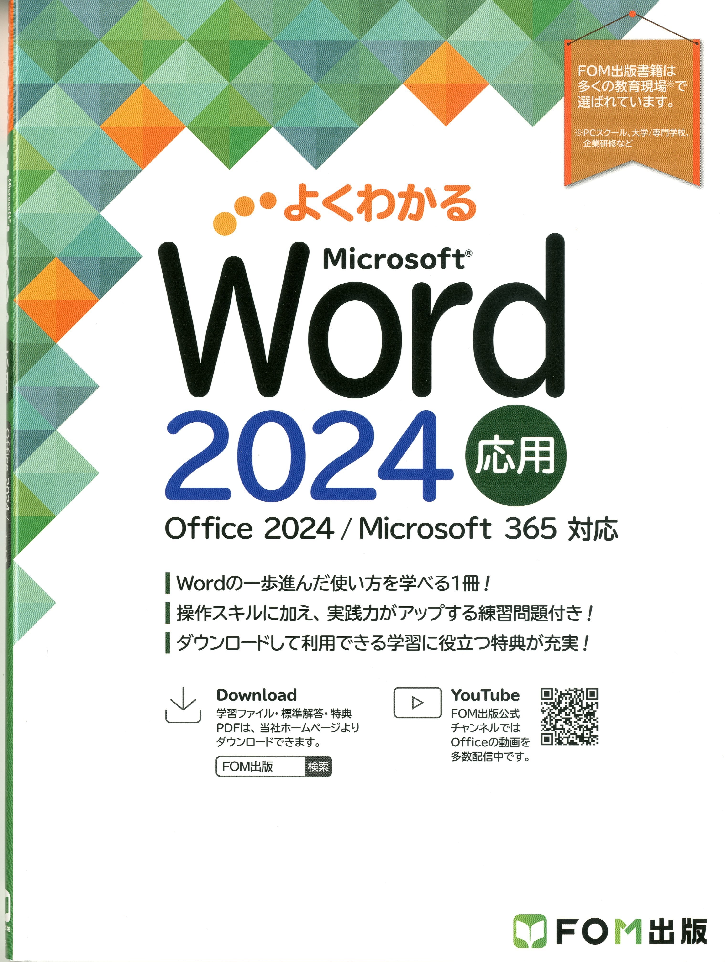 こちらは、FOM出版の「よくわかるWord2024応用」です。Wordの応用技術をしっかり学ぶために特別に設計された教材で、文書作成やレイアウト技術を効果的に身につけることができます。